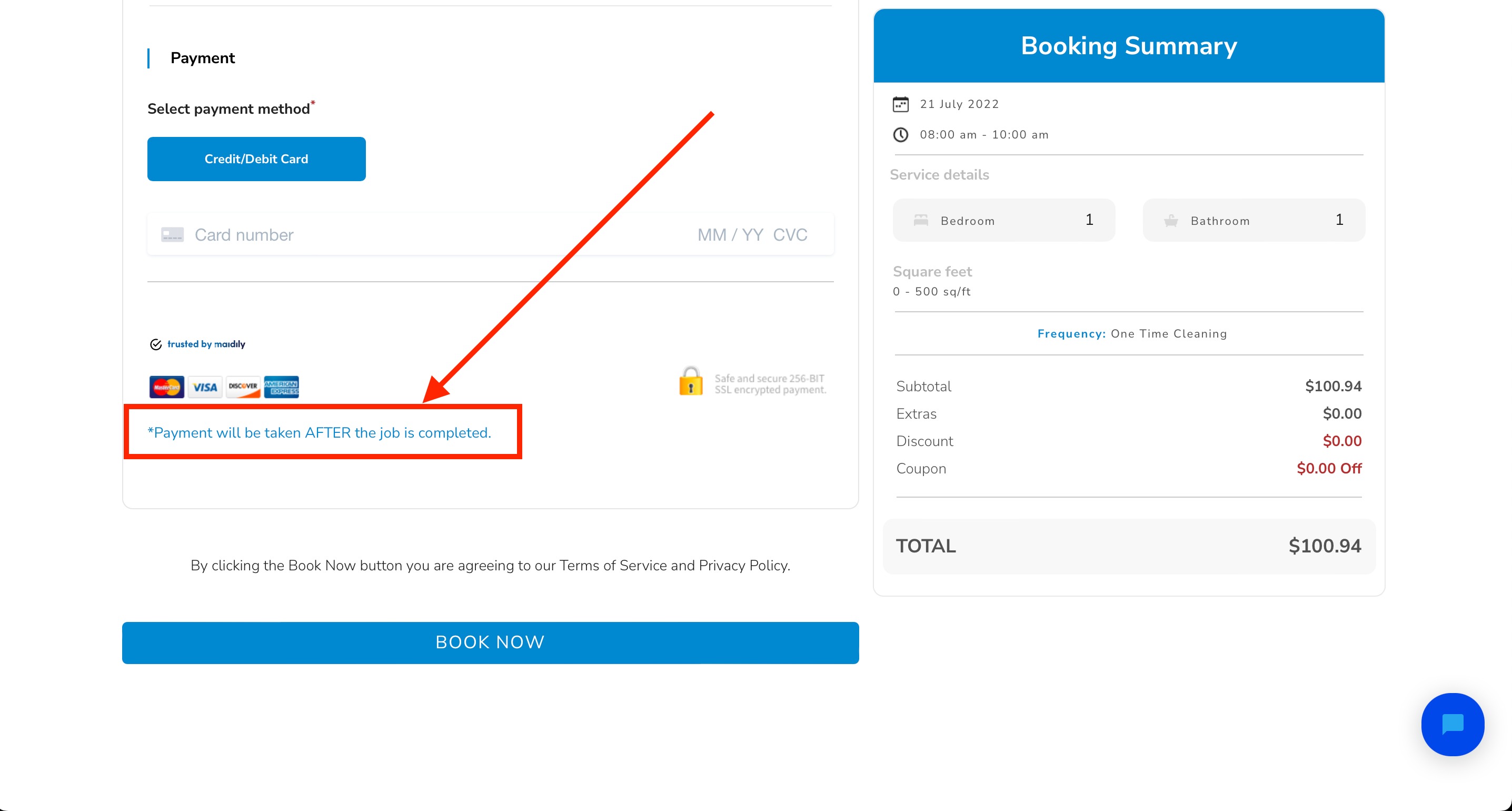 - Default payment text: *Payment will be taken AFTER the job is completed.