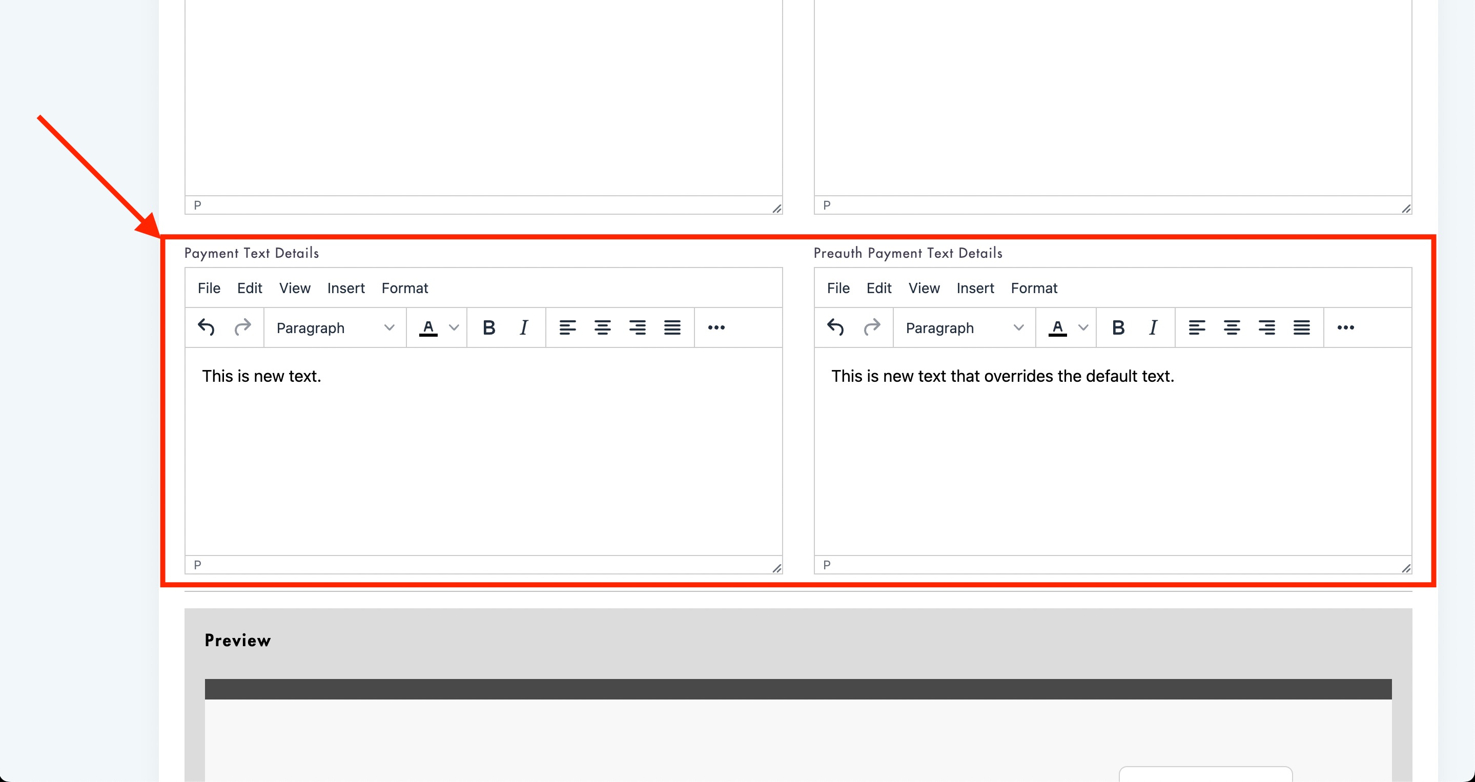 - The Preauth Payment Text Details will override the payment preauthorization text on the booking page