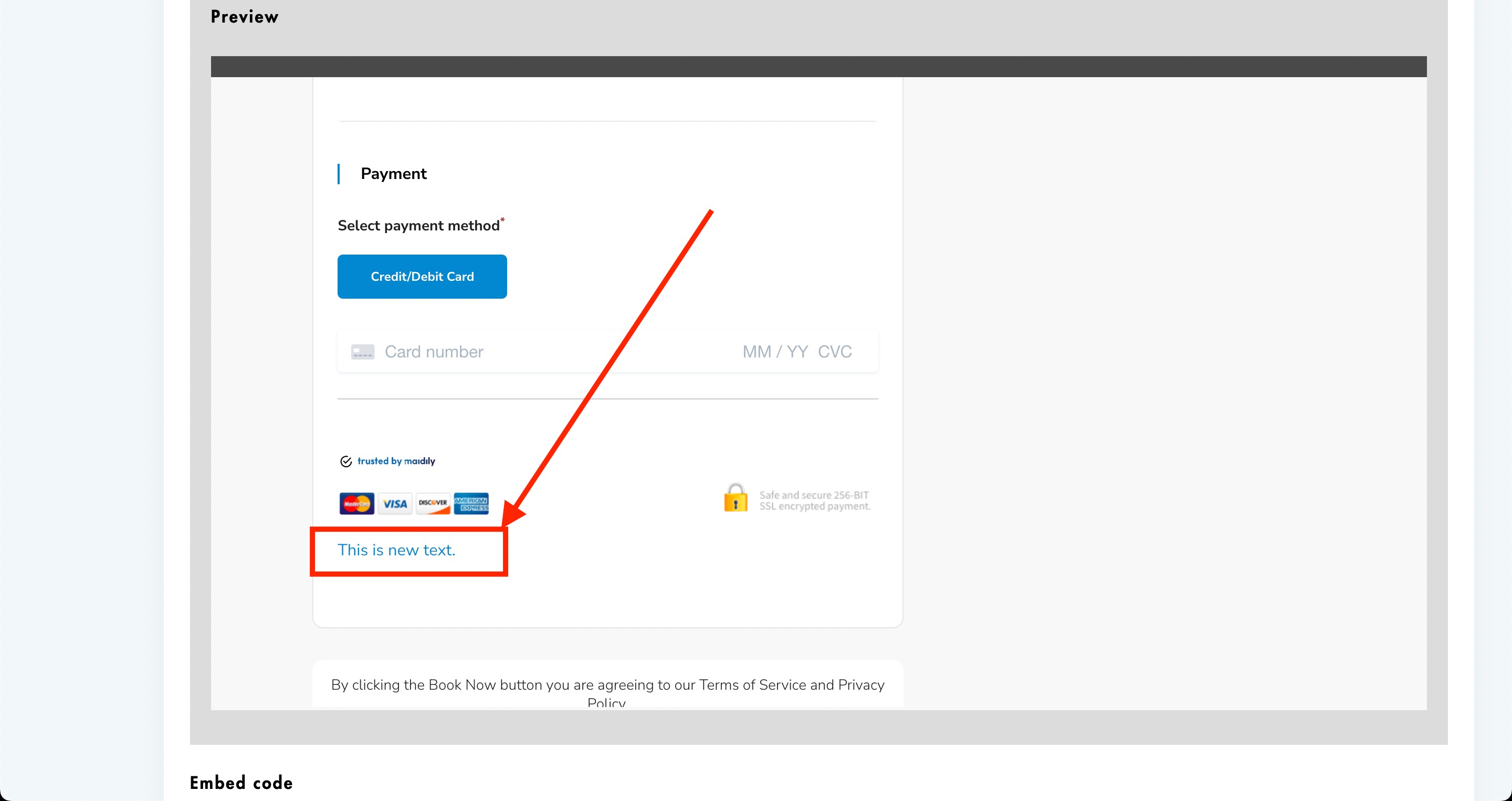 There is text at the bottom of the payment details section on the booking form that appears as default (but differs if you have payment preauthorization turned 'On')