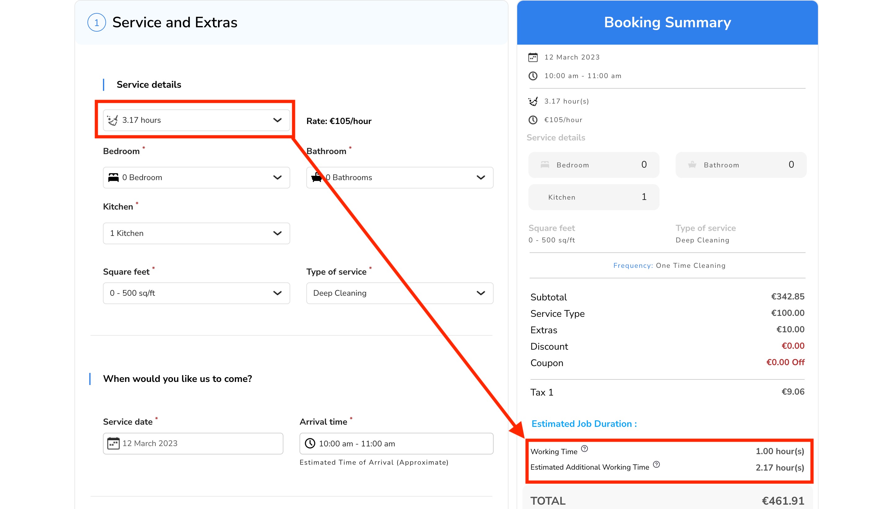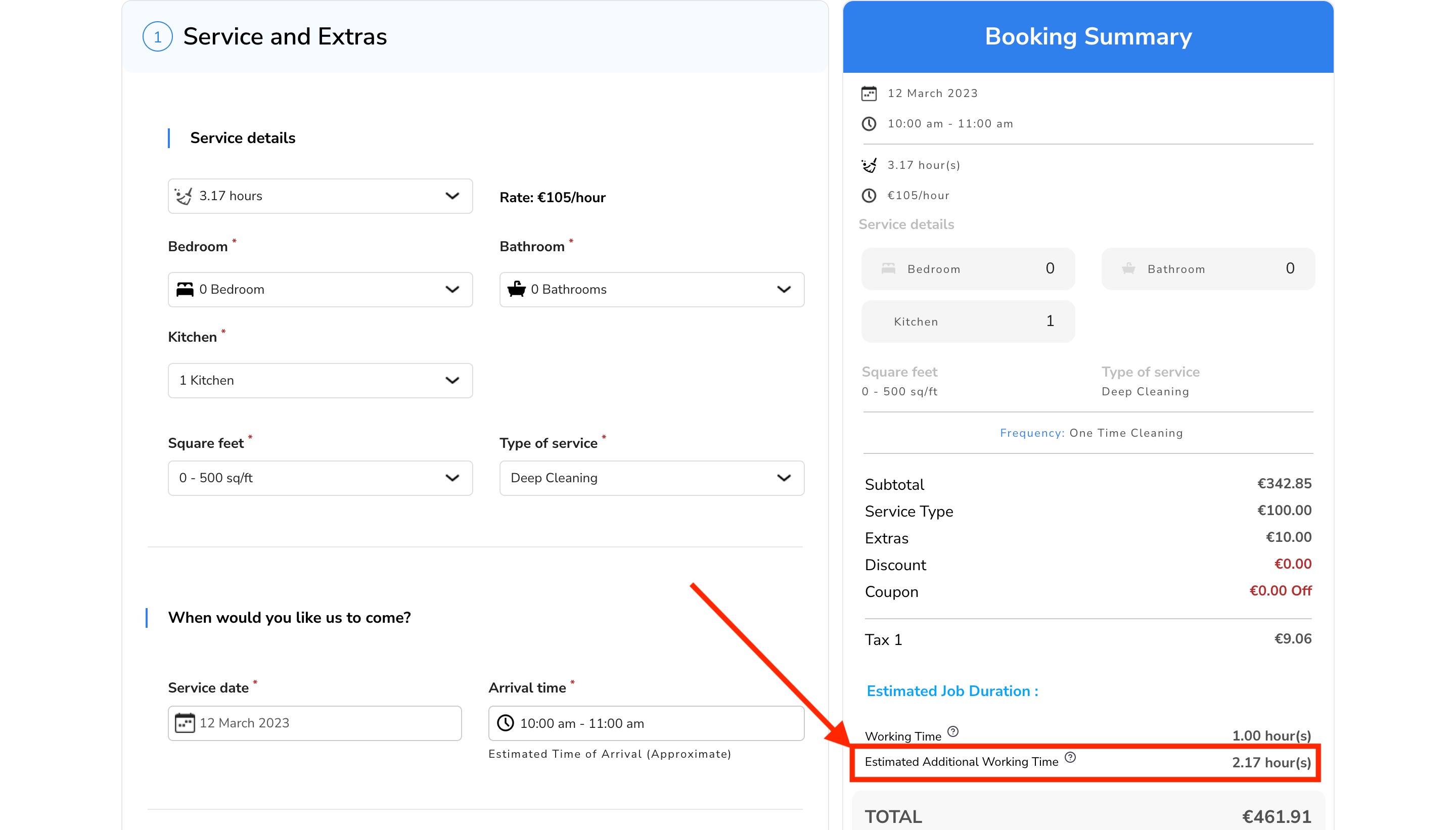 - The field 'Estimated Additional Working Time' will show the additional hours that have been calculated by choosing additional items that may have estimated working hours attached to them (ex: extras, different service types, more rooms)