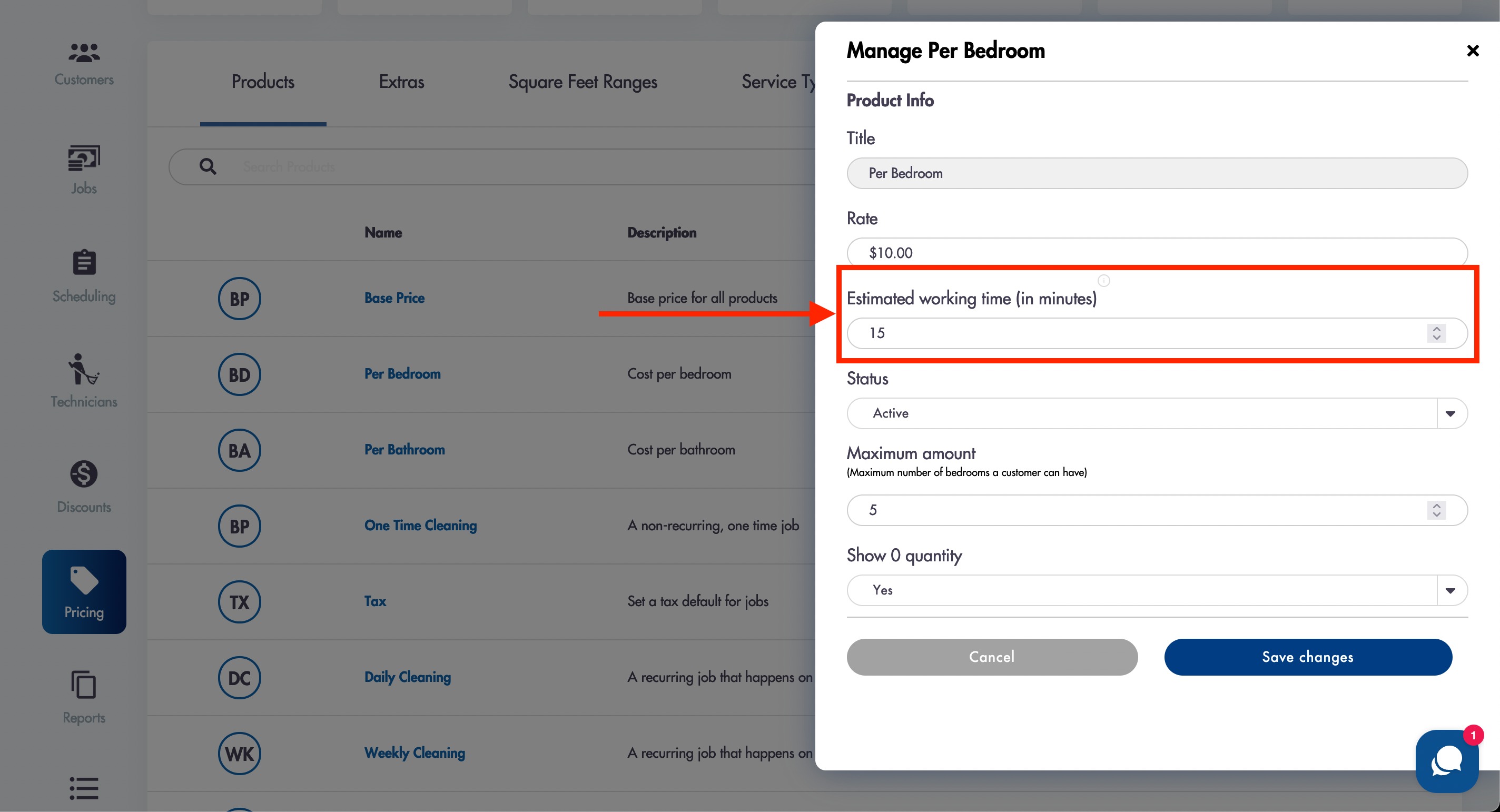 - Navigate to Pricing -> clicking into the relevant product -> Estimated working time (in minutes)