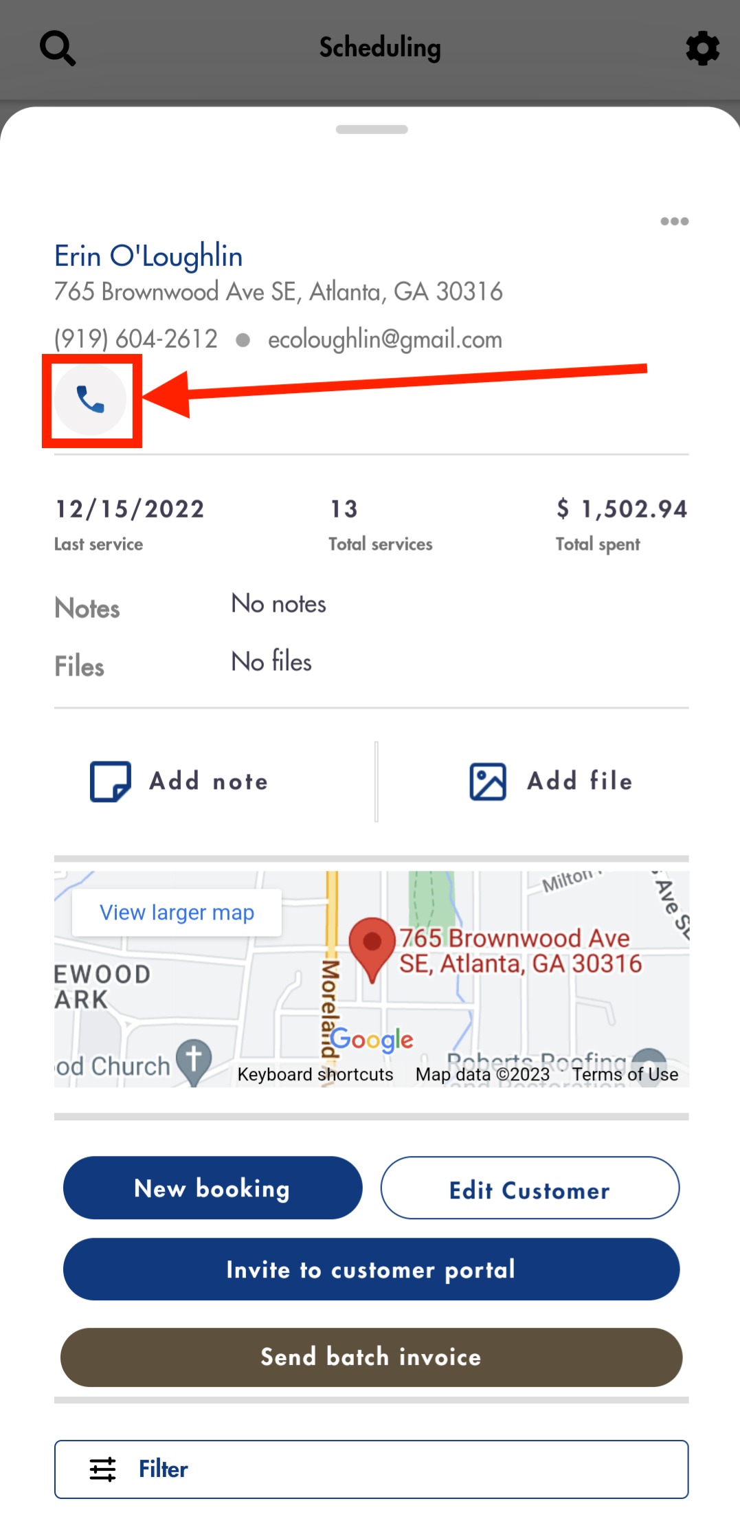 As an administrator, manager or technician you are able to call (free of charge) a customer directly through the customer profile by clicking on the 'Call customer' button when logged into your account from a laptop/desktop or by clicking on the phone icon in the Maidily app.