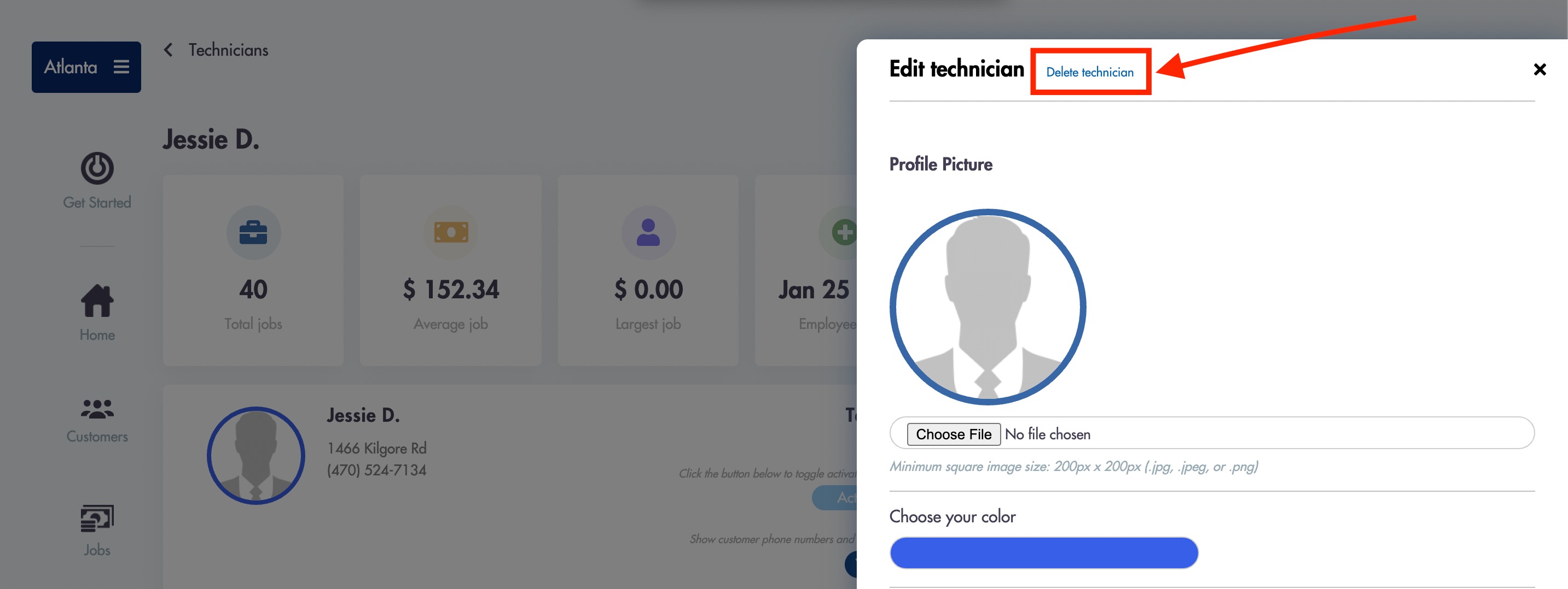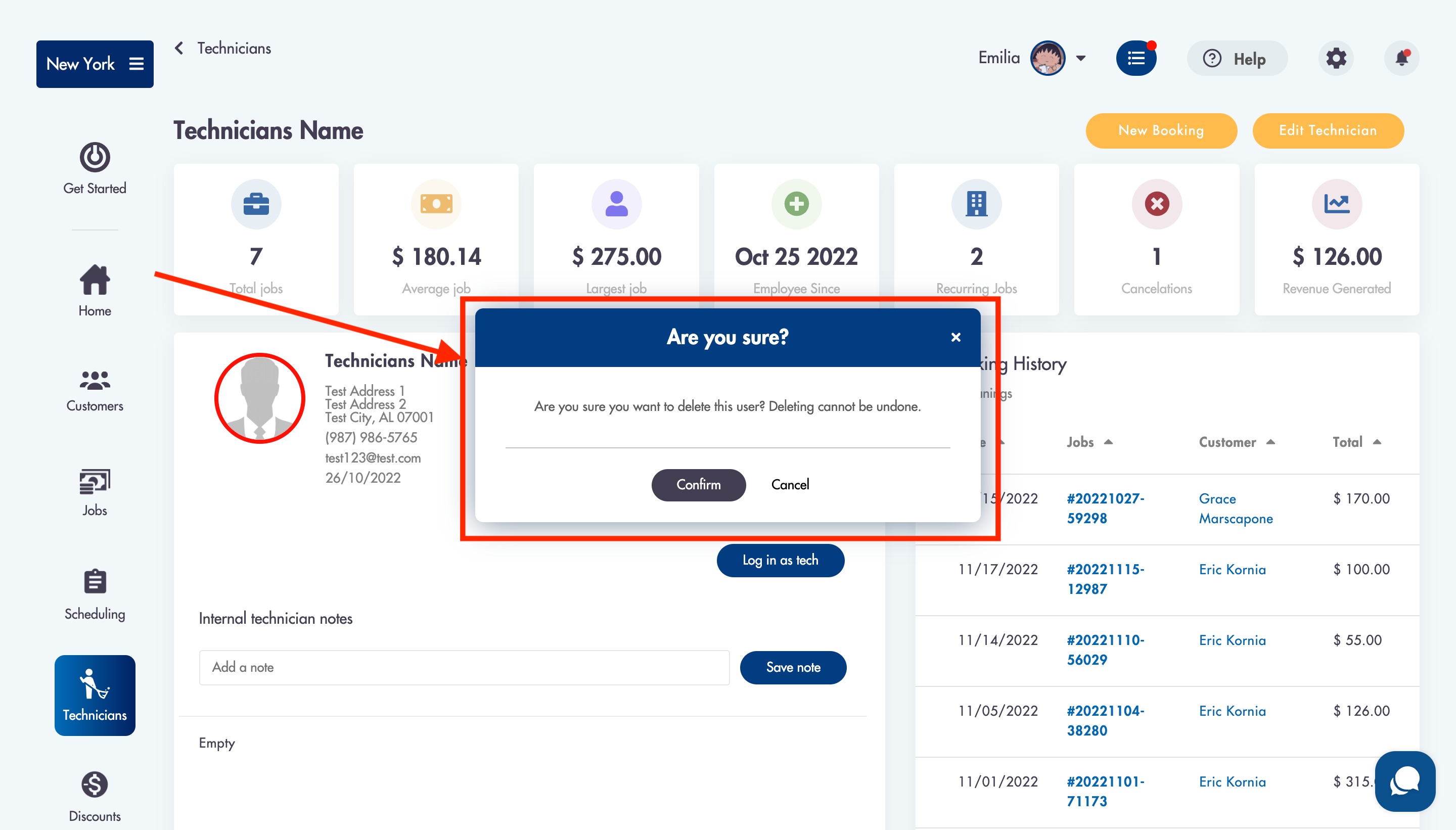 - Click into the technician's profile that you would like to delete
